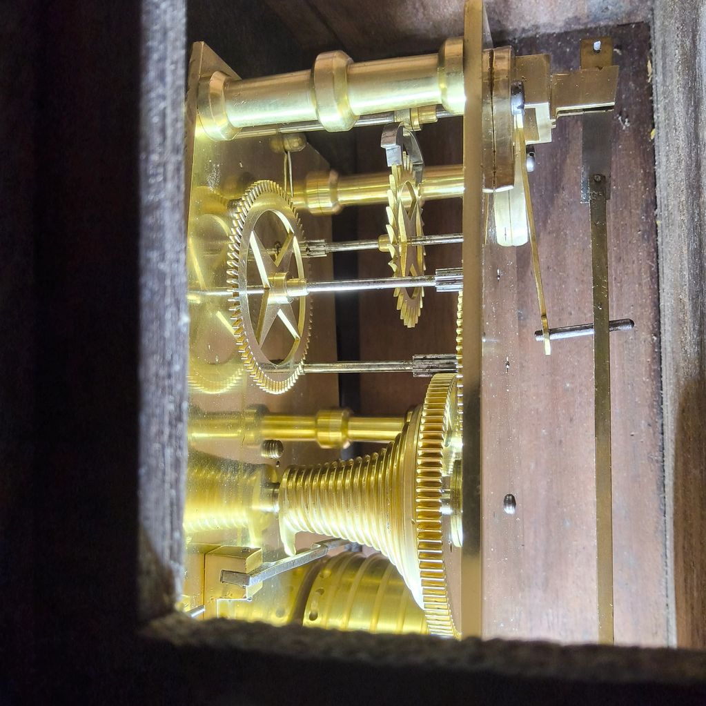 The mahagany case has been cleaned, oiled, and a coat of beeswax polish applied, has a lower access door and access door to the side.